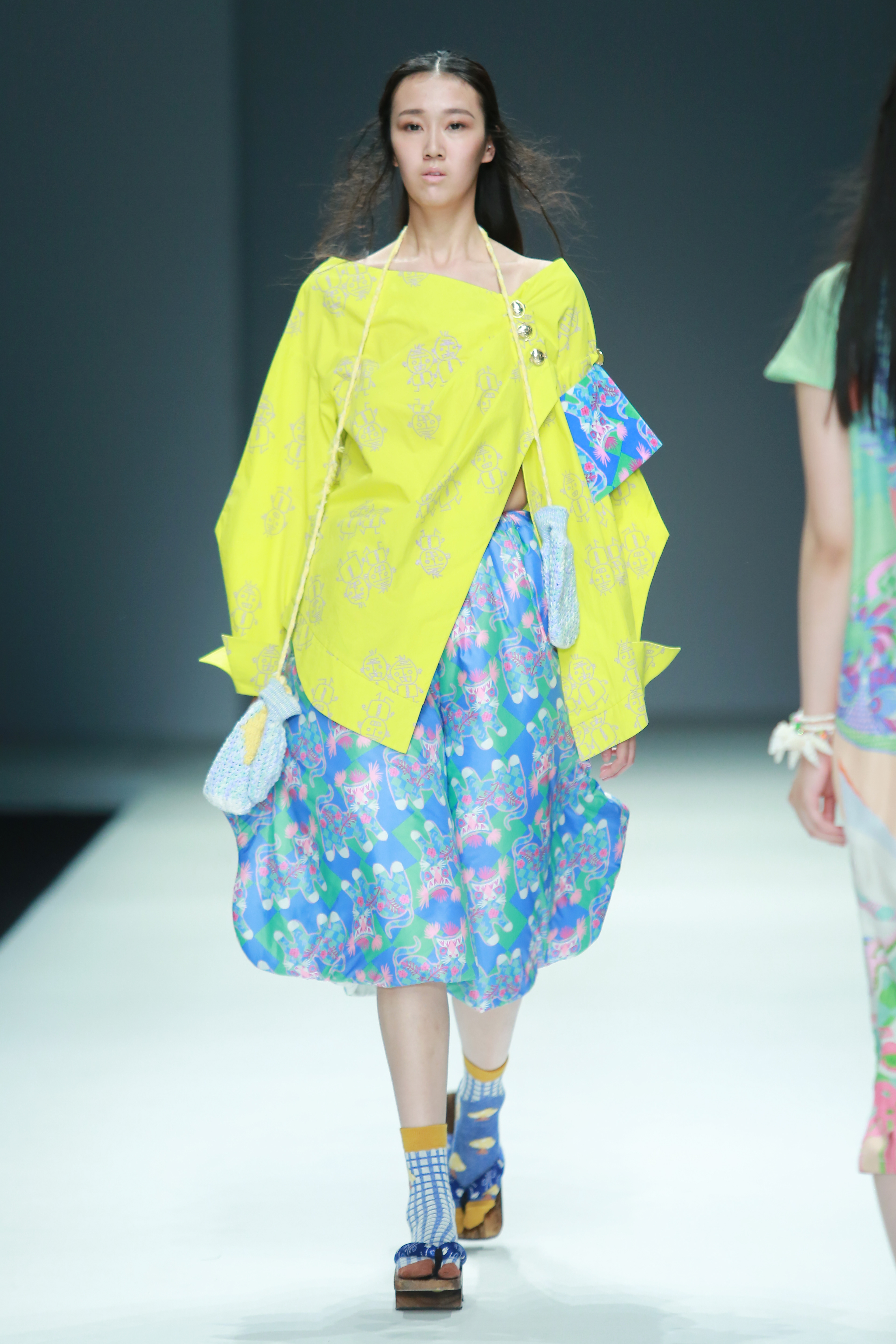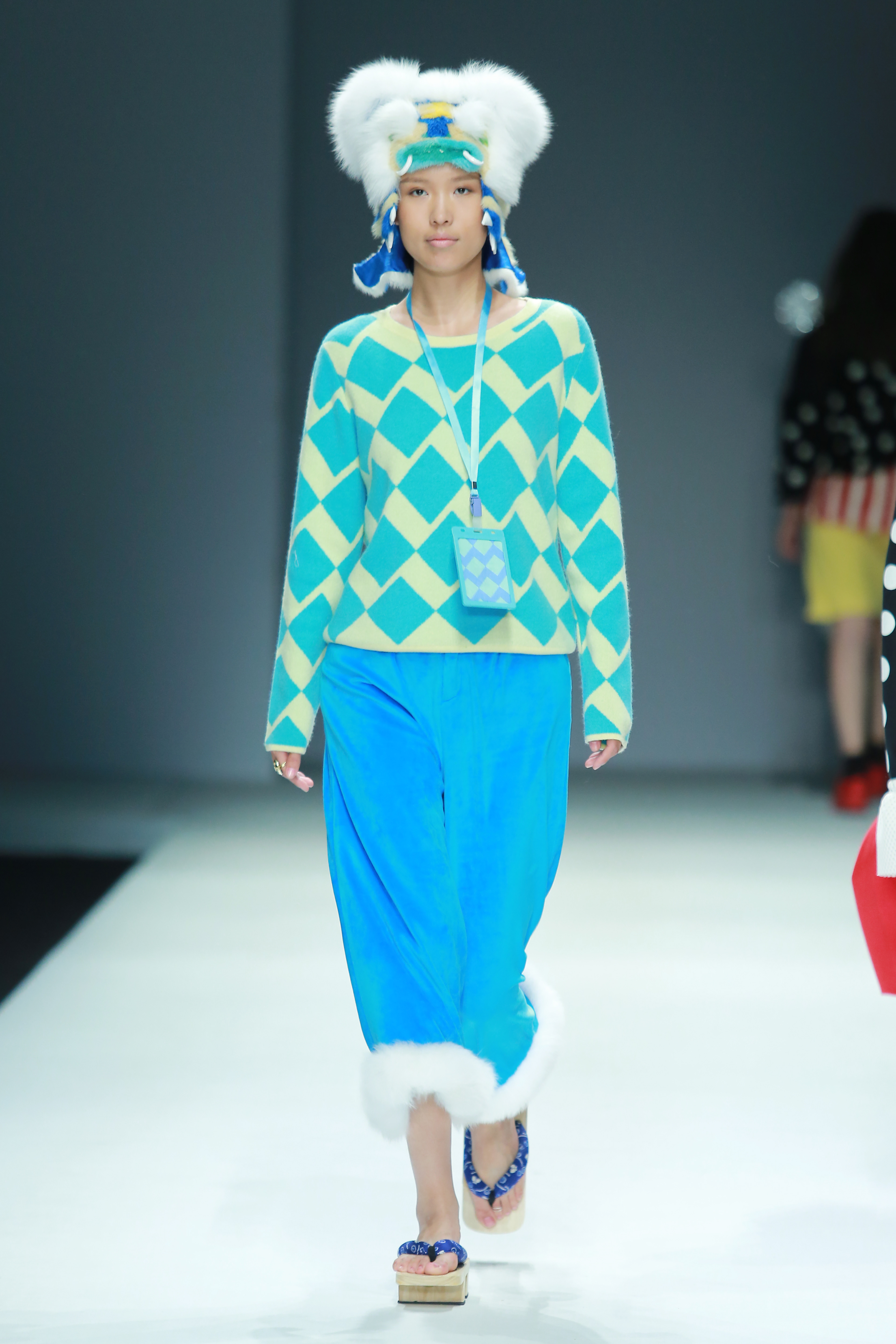 The silhouette adopts the characteristics of the Hutong grandpas' Oversize style and the design of the A-shaped diffusion shape, making the overall atmosphere more relaxed and casual. Relatively mild contrasts were used in the materials, such as cotton, nylon cotton pants, and gloves with thick stick stitches. I embroiled with chain stitches on some graphics of the top to make the texture richer. The colours were bold and lively, with high contrast and purity, giving a pleasant mood. In the pattern, in addition to modernizing the traditional tiger pattern, the Grandpa Ding pattern is used on the top and the detailed buttons. This pattern strongly correlates with memories of childhoods in the post-80s and post-90s. To this day, children still sing comic songs while drawing the Grandpa Ding pattern. I used the clogs to make the style more integral and relaxed. I was inspired by a Beijing hutong senior wearing these seemingly inappropriate shoes in the Summer Palace in Beijing, roaming in once the stately royal gardens, nowadays a soothing tourist attraction.